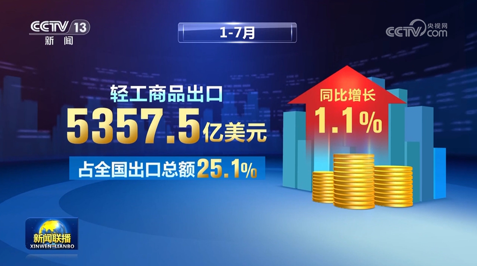 出口方面,繼續保持韌性。1—7月,輕工商品出口5357.5億美元,占全國出口總額25.1%,同比增長1.1%;21個大類行業中11個保持增長。