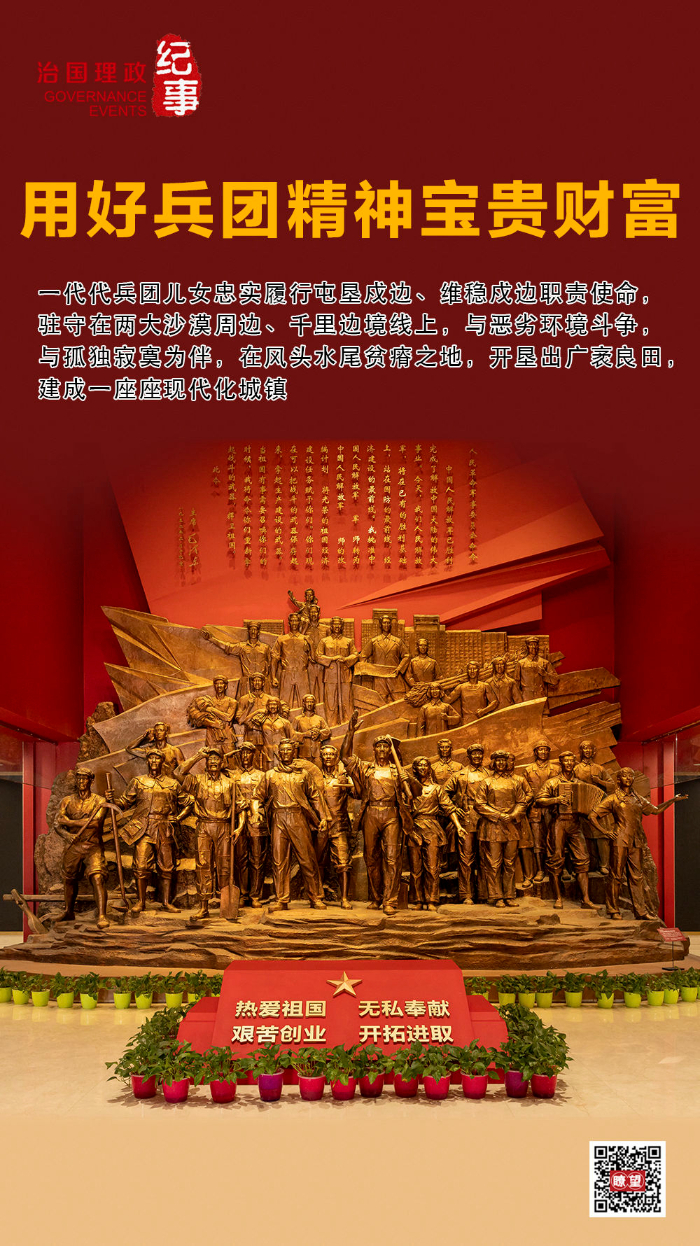 ◇2022年7月,習近平總書記在新疆考察時來到新疆生產建設兵團八師石河子市,參觀新疆兵團軍墾博物館。會見兵團老中青三代建設者代表時,他強調,新疆生產建設兵團為推動新疆發展、增進民族團結、維護社會穩定、鞏固國家邊防作出了不可磨滅的貢獻。兵團人鑄就的熱愛祖國、無私奉獻、艱苦創業、開拓進取的兵團精神,是中國共產黨人精神譜系的重要組成部分,要用好這些寶貴財富。