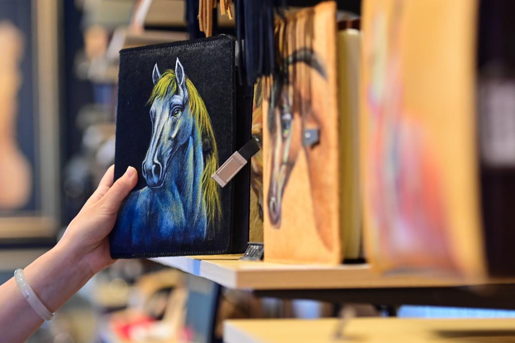 “伊犁是‘天馬之鄉(xiāng)’,我們在皮毛一體的馬皮上進行手工繪畫,每幅圖案都是獨一無二的,讓非遺與旅游深度融合。”店長茹柯耶·艾散介紹,店鋪還開發(fā)出馬毛筆記本、首飾等文創(chuàng)衍生品,深受年輕人喜愛。