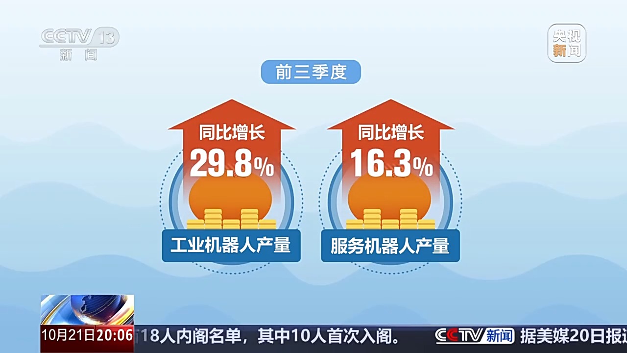 第三季度,我國規(guī)模以上高技術制造業(yè)增加值同比增速明顯快于全部工業(yè);信息傳輸、軟件和信息技術服務業(yè)增加值增長11.7%,比上年同期加快1.7個百分點。前三季度,規(guī)模以上高技術制造業(yè)增加值同比增長9.6%;工業(yè)機器人、服務機器人等產(chǎn)品產(chǎn)量分別增長29.8%、16.3%。