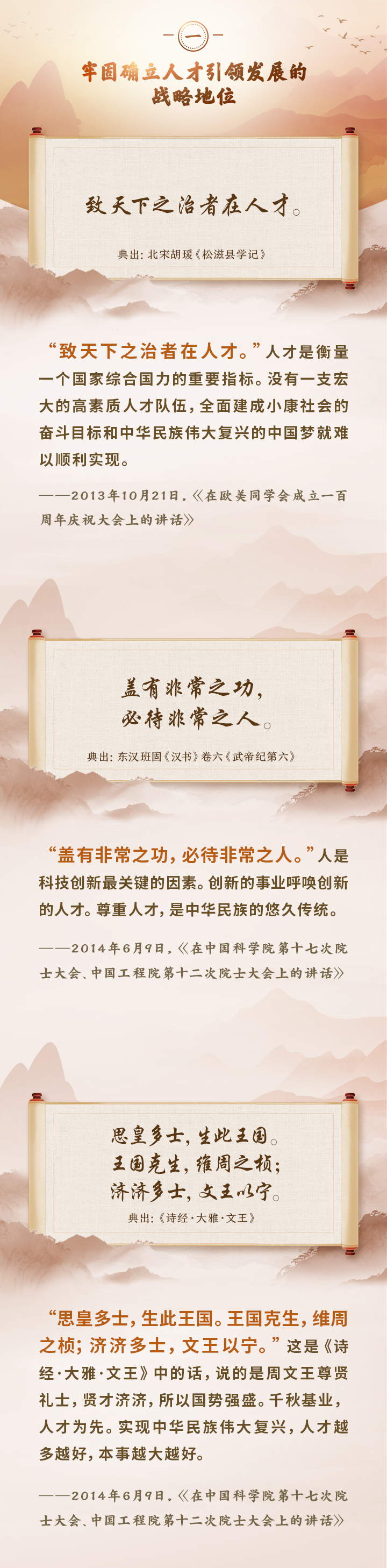 編者按:培養(yǎng)造就大批德才兼?zhèn)涞母咚刭|(zhì)人才,是國家和民族長遠發(fā)展大計。黨的十八大以來,習(xí)近平總書記圍繞人才工作發(fā)表一系列重要論述,立意高遠,內(nèi)涵豐富,思想深刻,深刻回答了為什么建設(shè)人才強國、什么是人才強國、怎樣建設(shè)人才強國的重大理論和實踐問題。在這些重要論述中,總書記精妙運用古代典籍、經(jīng)典名句,以古喻今、啟迪思想、激蕩精神,讓我們一起來學(xué)習(xí)!