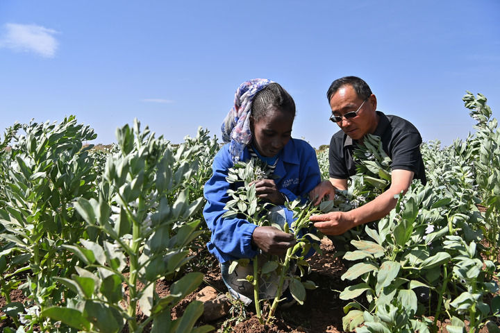 2023年9月27日,在位于厄立特里亞阿斯馬拉的農業技術援助項目示范地,中國援厄第三期高級農業專家組豆類作物專家劉運民(右)指導當地農戶進行蠶豆作物的田間管理。新華社記者 韓旭 攝