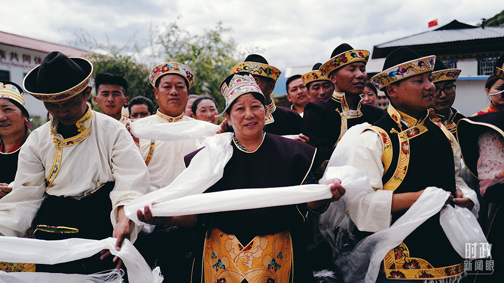 2021年7月,習(xí)近平總書記來到西藏林芝市嘎拉村考察。村民們手捧哈達(dá),熱情迎接。(總臺央視記者彭漢明拍攝)