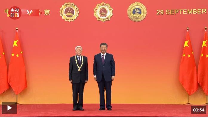 中華人民共和國國家勛章和國家榮譽稱號頒授儀式9月29日上午10時在人民大會堂隆重舉行。中共中央總書記、國家主席、中央軍委主席習近平向“人民科學家”國家榮譽稱號獲得者趙忠賢頒授獎章。