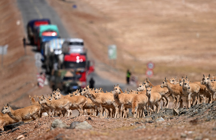 2023年5月29日,當地管理部門工作人員在青藏公路上臨時截停來往車輛,為一群前往可可西里卓乃湖產仔的藏羚羊讓路。可可西里地處三江源國家公園,是國家一級保護動物藏羚羊重要的棲息地。每年5月至7月,來自青海三江源、新疆阿爾金山、西藏羌塘的雌性藏羚羊會遷徙到可可西里卓乃湖,待產仔后再攜幼仔返回原棲息地。