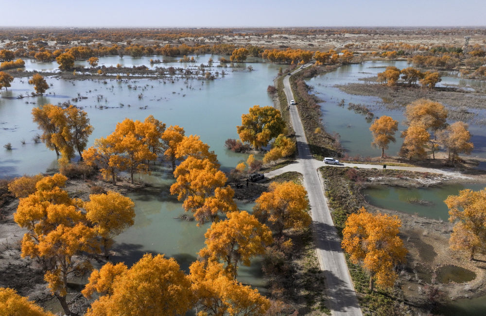 2023年11月4日拍攝的新疆尉犁縣羅布淖爾國家濕地公園(無人機照片)。新疆沿塔里木河流域分布著約1500萬畝胡楊林,是世界面積最大的胡楊林區。