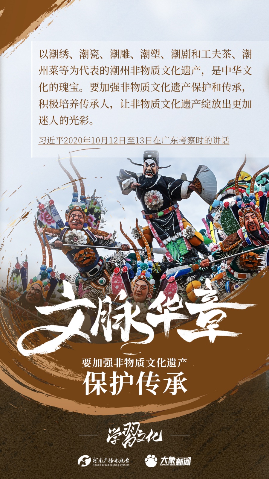 非物質(zhì)文化遺產(chǎn)是中華優(yōu)秀傳統(tǒng)文化的重要組成部分,是中華文明綿延傳承的生動(dòng)見(jiàn)證,是我國(guó)各族人民寶貴的精神財(cái)富。習(xí)近平總書記十分關(guān)心非物質(zhì)文化遺產(chǎn)的保護(hù)傳承,多次強(qiáng)調(diào)“要扎實(shí)做好非物質(zhì)文化遺產(chǎn)的系統(tǒng)性保護(hù)”“培養(yǎng)好傳承人”等。大象新聞為您梳理,邀您一起學(xué)習(xí)、領(lǐng)悟、踐行。