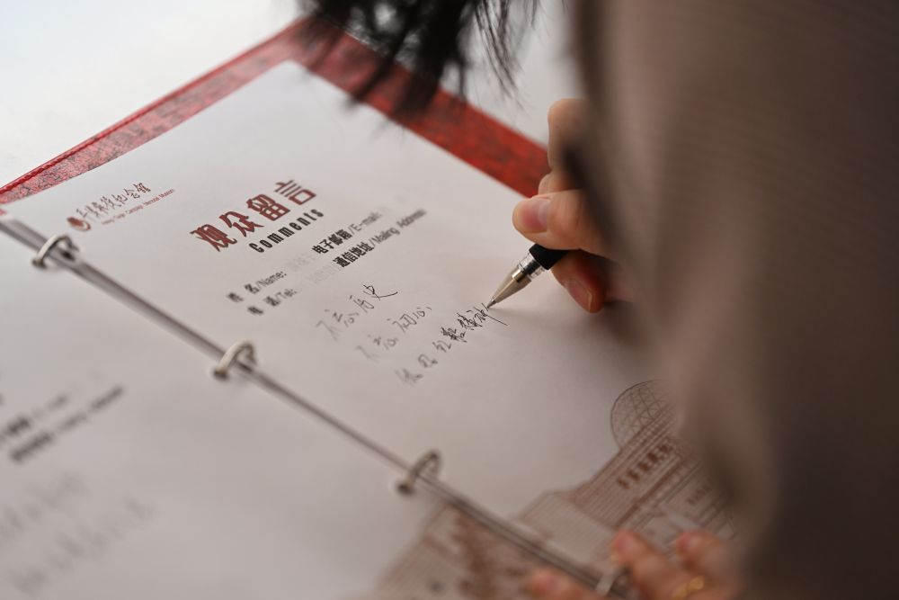 2025年3月31日,參觀者在江蘇省徐州市淮海戰役紀念館留言簿上留言。