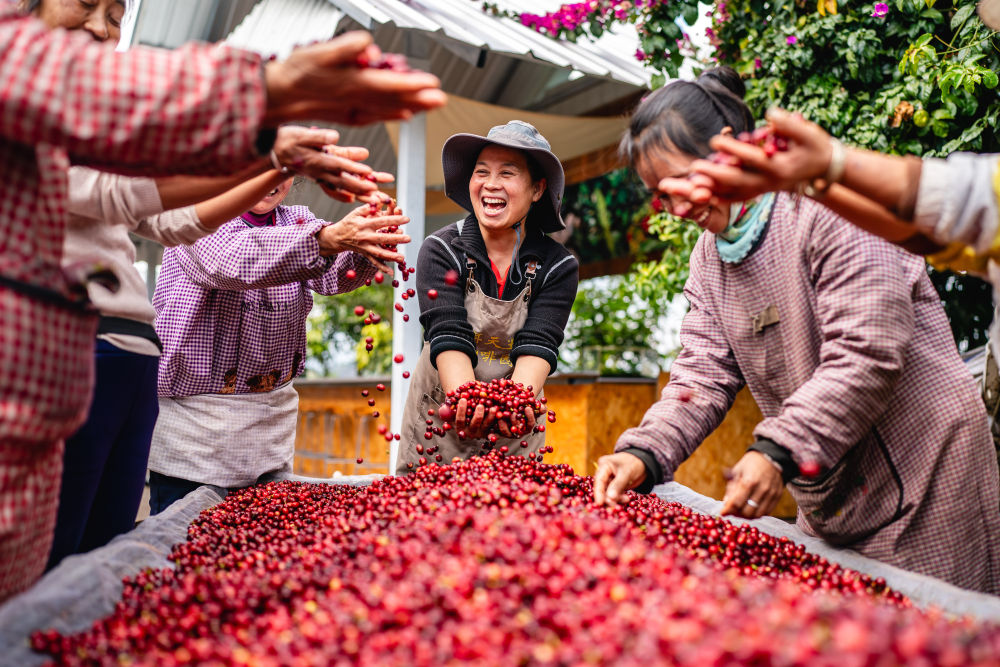 在云南省普洱市思茅區天玉咖啡莊園,莊園經營者玉噸(中)和工作人員慶??Х蓉S收(2025年1月8日攝)。新華社記者 胡超 攝