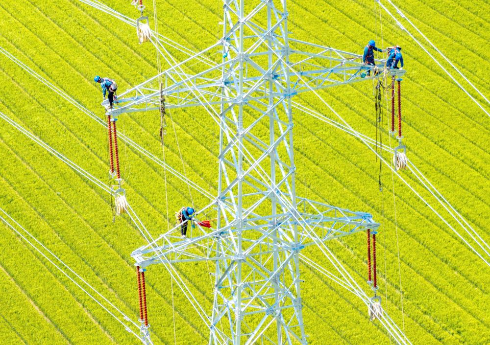 2025年5月4日,電力施工人員在江蘇省揚州市江都區武堅鎮至江蘇省興化經濟開發區的220千伏華電武堅25萬千瓦集中式光伏項目配套輸電線路上作業(無人機照片)。新華社發(任飛攝)
