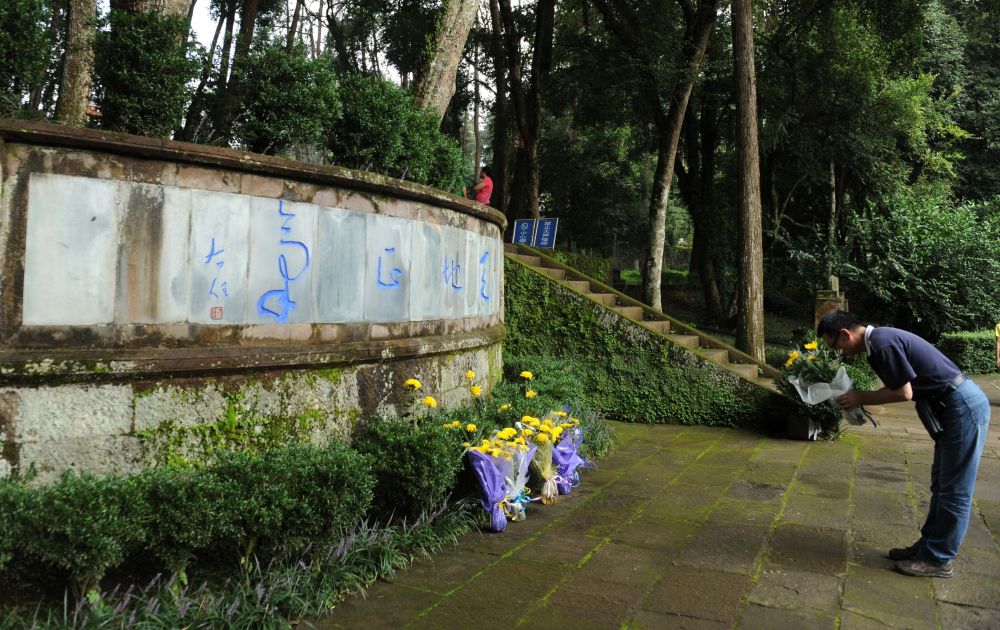 2012年8月15日,云南騰沖各地群眾前往“國殤墓園”和“騰沖滇西抗戰博物館”等愛國主義教育基地,祭奠抗戰先烈。這是一位市民在“國殤墓園”緬懷英烈。