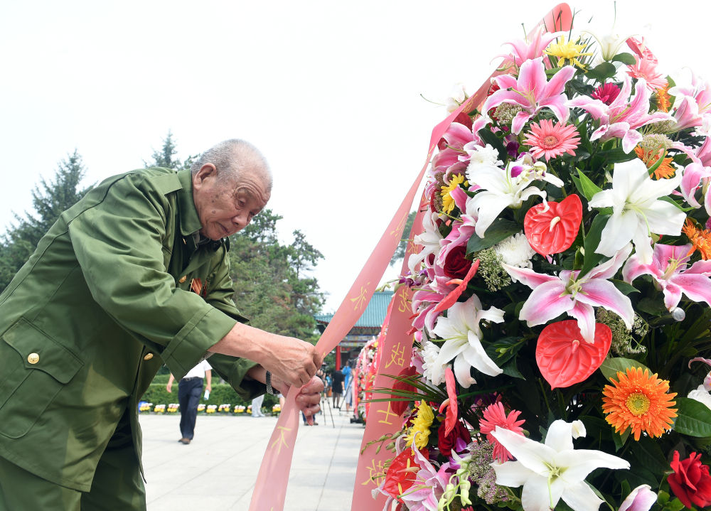 2015年8月15日,吉林省紀念東北抗聯精神大會在吉林通化舉行,各界群眾來到通化市楊靖宇烈士陵園,緬懷犧牲的東北抗聯將士。這是一位東北抗聯老戰士為烈士敬獻花圈。