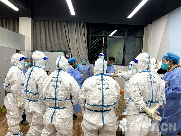 圖為拉薩市第二座方艙醫院醫護人員們正在穿防護服準備開始一天的工作 攝影:次仁卓瑪