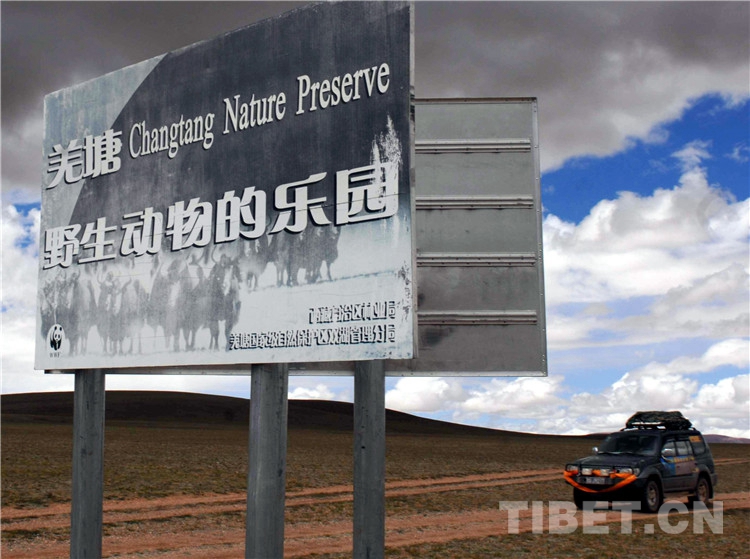 圖為一輛自駕游車輛通過羌塘國家級自然保護(hù)區(qū)的標(biāo)志牌(2009年) 攝影:唐召明