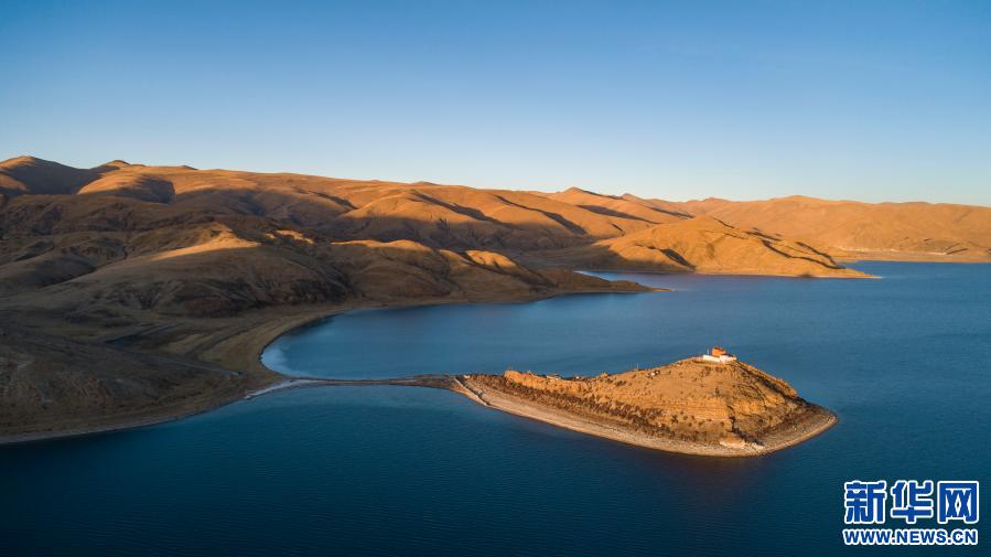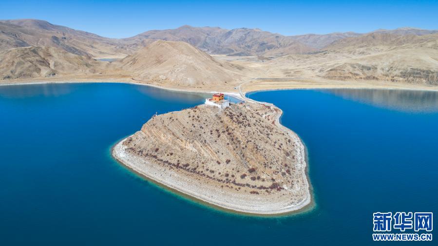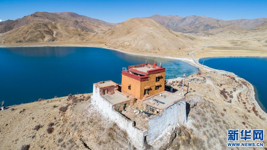坐落于羊湖北岸一座小島上的日托寺(無人機(jī)照片,1月10日攝)。新華社記者 孫非 攝