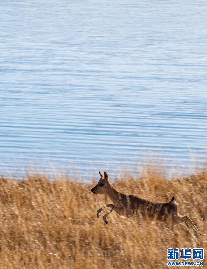 在羊湖岸邊草叢里奔跑的藏原羚(1月10日攝)。新華社記者 孫非 攝