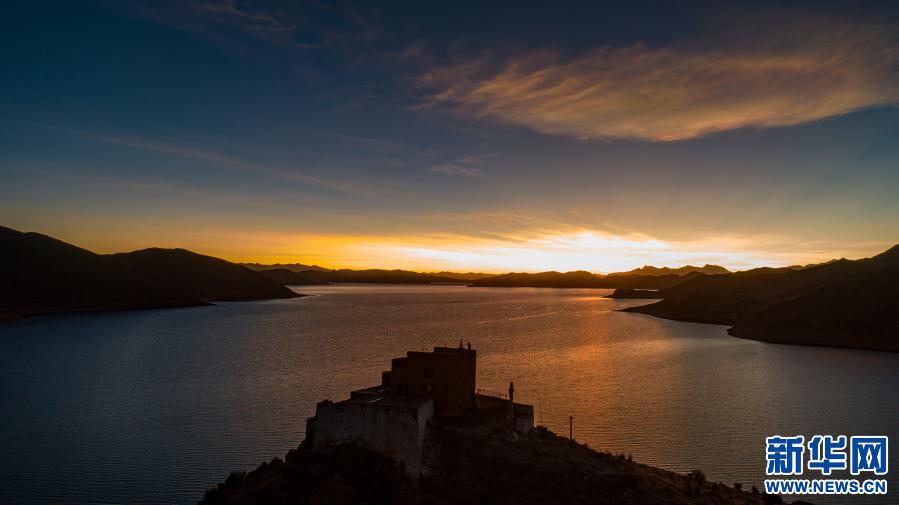 落日余暉下,日托寺的影子倒映在羊湖湖面(無人機(jī)照片,1月9日攝)。新華社記者 孫非 攝