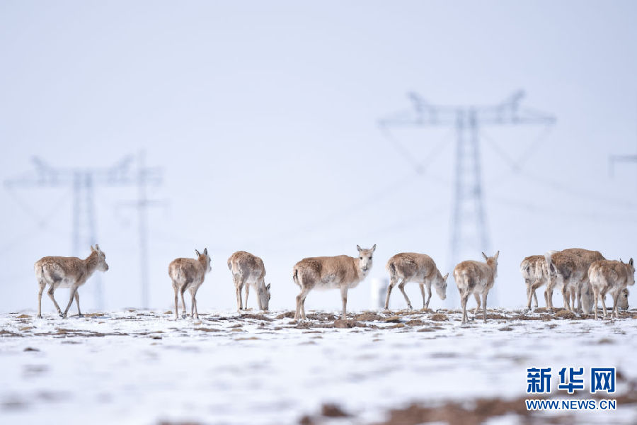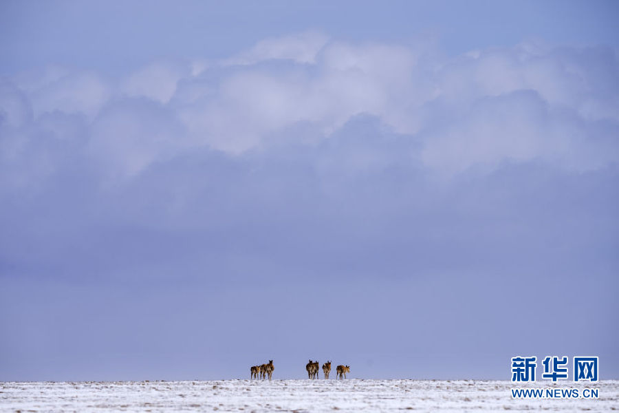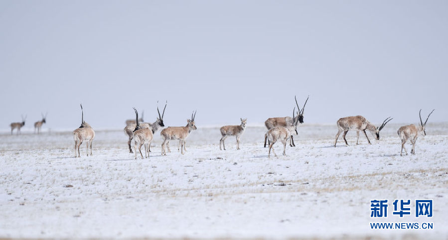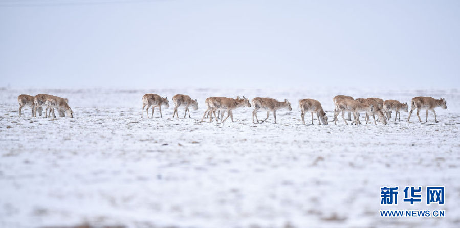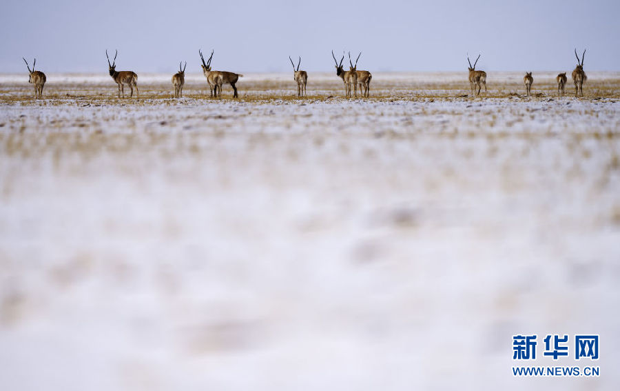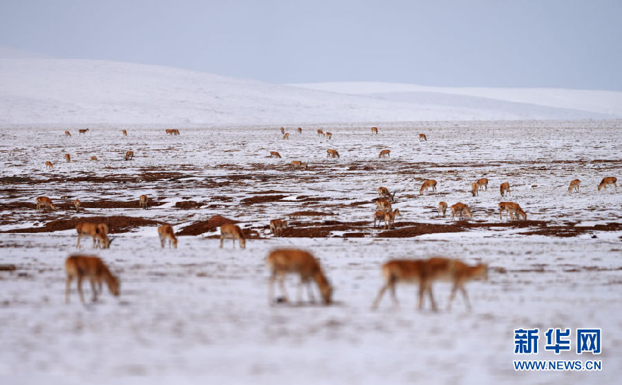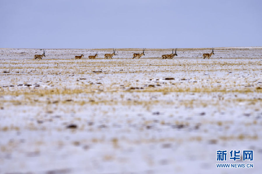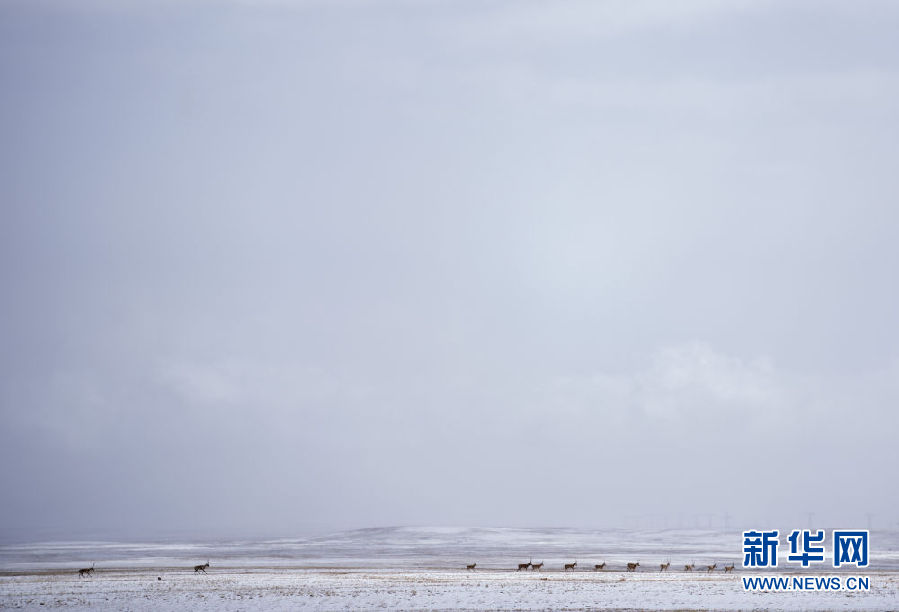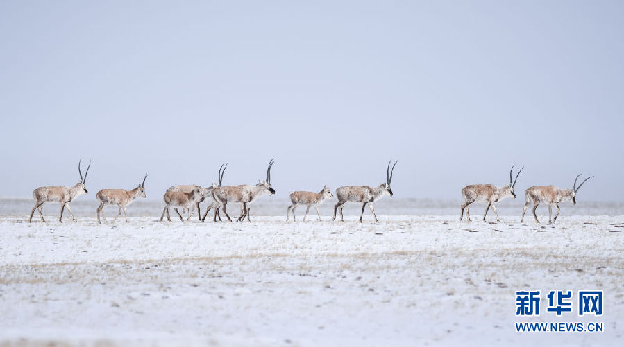 近日,可可西里迎來降雪,大量藏羚羊匯聚在可可西里五道梁地區,踏上遷徙之路。