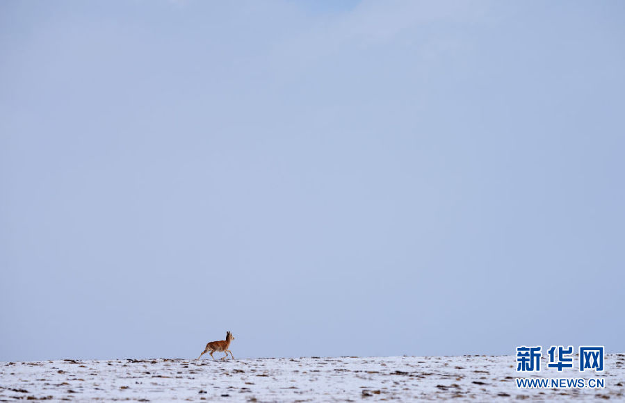 4月20日,一只藏羚羊向卓乃湖方向行進。新華社記者 吳剛 攝