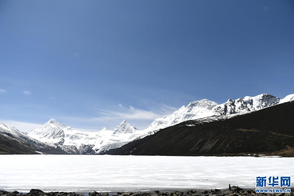 一陣強風掠過薩普雪山腳下的冰湖時卷起湖面的薄冰(5月4日攝)。新華社記者 孫瑞博 攝