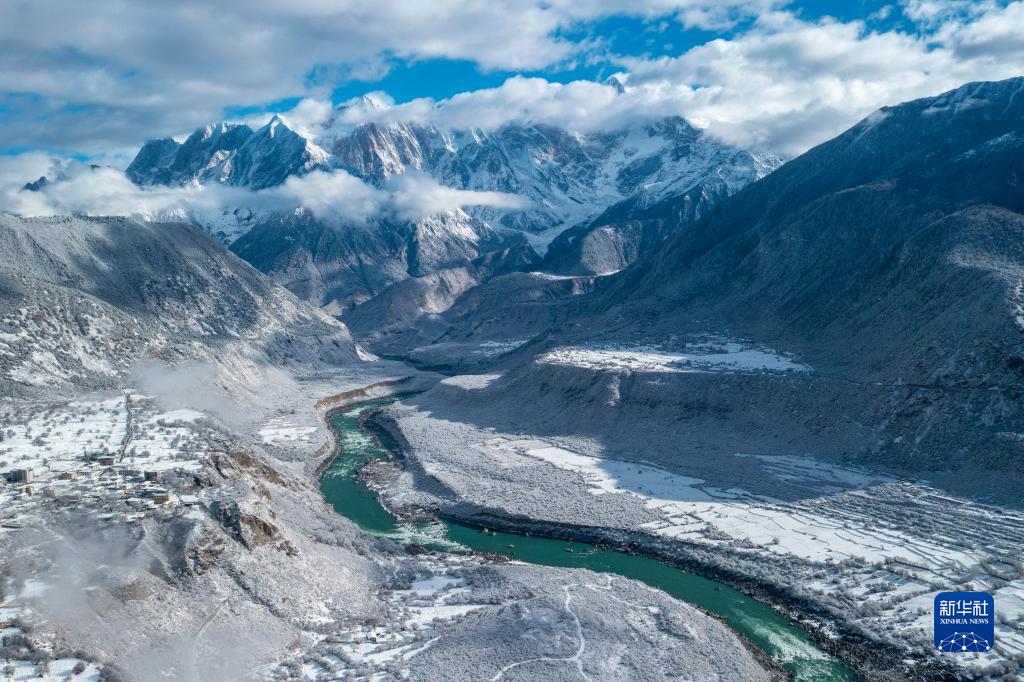 當日,西藏林芝市米林縣派鎮雅魯藏布大峽谷附近普降瑞雪,銀裝素裹的雅魯藏布江和南迦巴瓦峰顯得格外壯美。