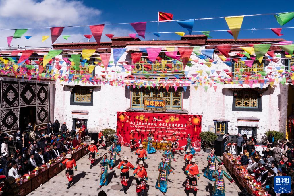 當日,西藏拉薩市城關區在八廓街老大院夏扎內開展迎春節藏歷新年主題活動,來自大院附近的多民族居民一起載歌載舞,迎接春節、藏歷新年。