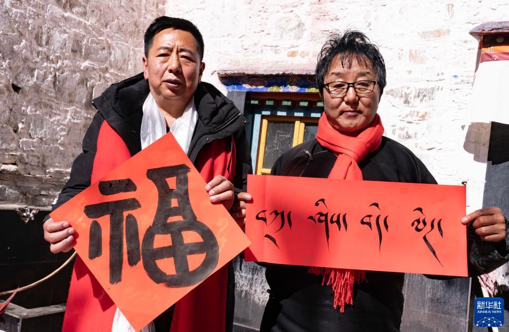 1月26日,書法家展示現場書寫的祝福字。新華社記者 普布扎西 攝