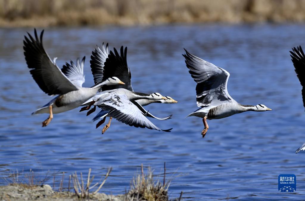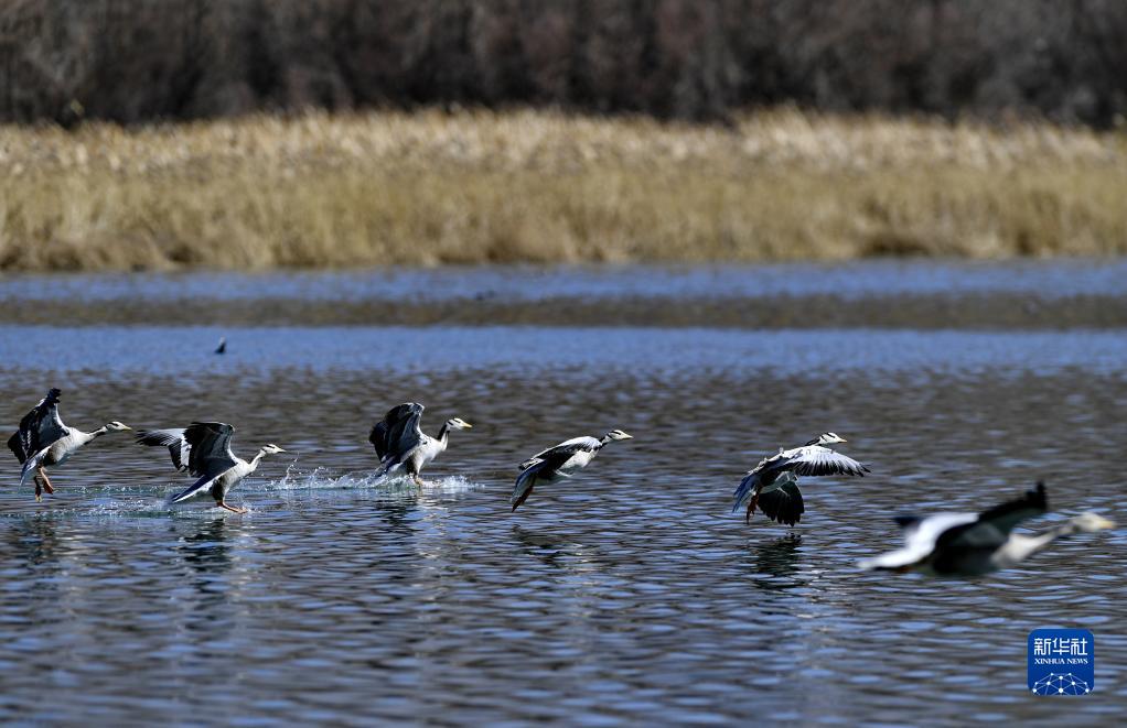 斑頭雁在拉魯濕地的水面上飛舞(3月20日攝)。新華社記者 張汝鋒 攝