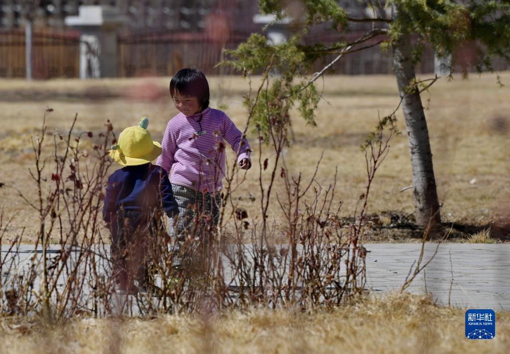孩子們在拉魯濕地邊玩耍(3月20日攝)。新華社記者 張汝鋒 攝