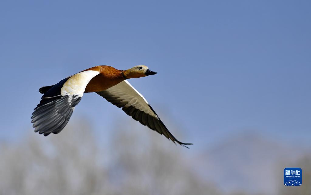 赤麻鴨在拉魯濕地上空飛翔(3月20日攝)。新華社記者 張汝鋒 攝