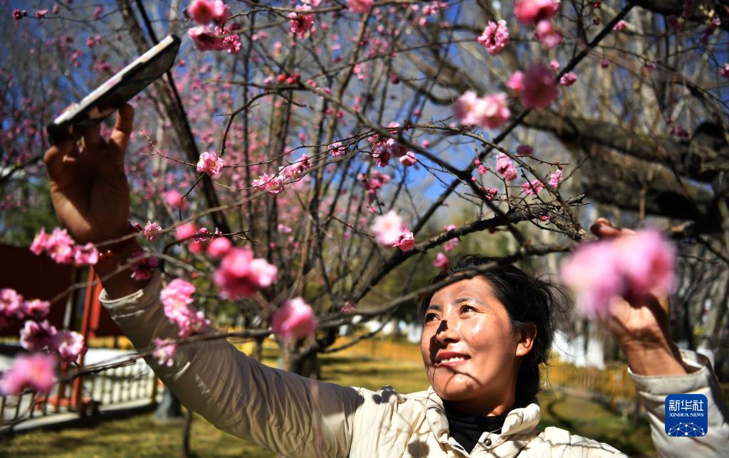 3月20日,一名女子在拉薩市龍王潭公園內的春花前自拍留影。新華社記者 覺果 攝