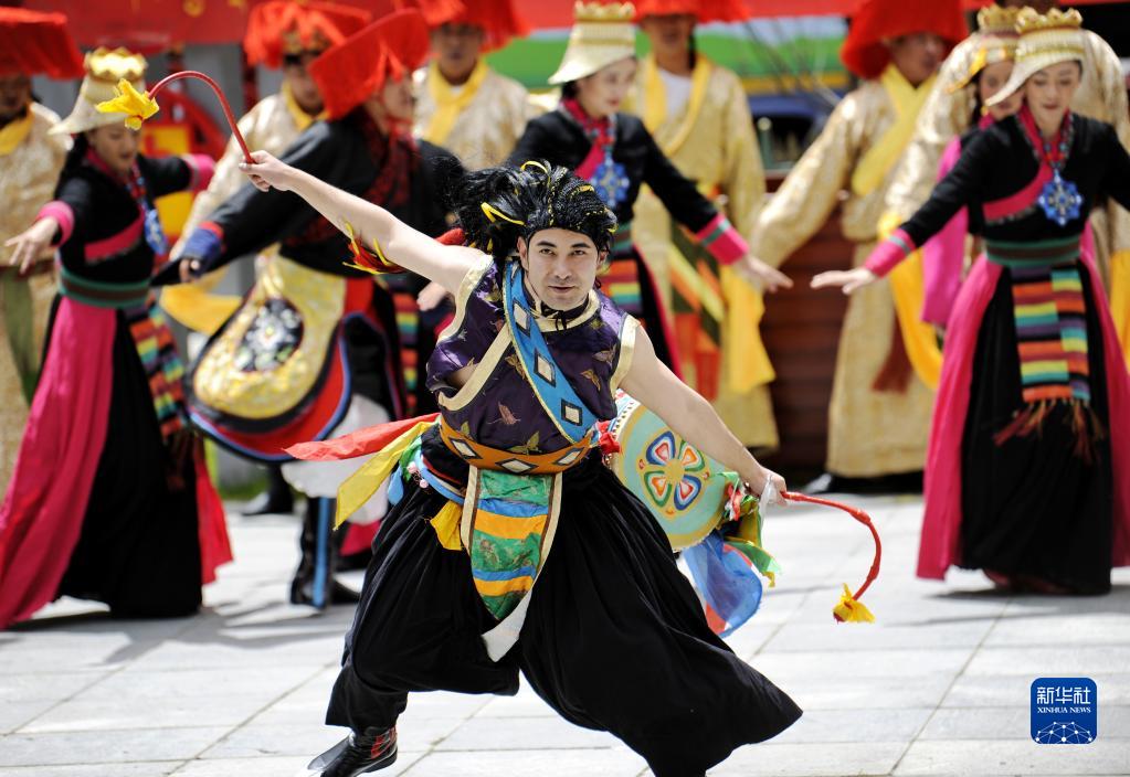 5月31日,演員在隆子縣玉麥鄉(xiāng)文化廣場(chǎng)表演歌舞劇《天邊格桑花》。新華社記者 張汝鋒 攝