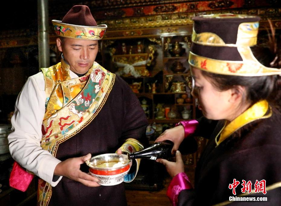 11月24日恰逢藏歷十月初一,西藏林芝迎來2023年工布新年,這是西藏最早的新年。工布新年以其悠久的歷史、鮮明的特色、豐富的內涵,于2006年被列入第一批西藏自治區非物質文化遺產保護名錄。圖為村民向客人敬酒。 阿仁 攝