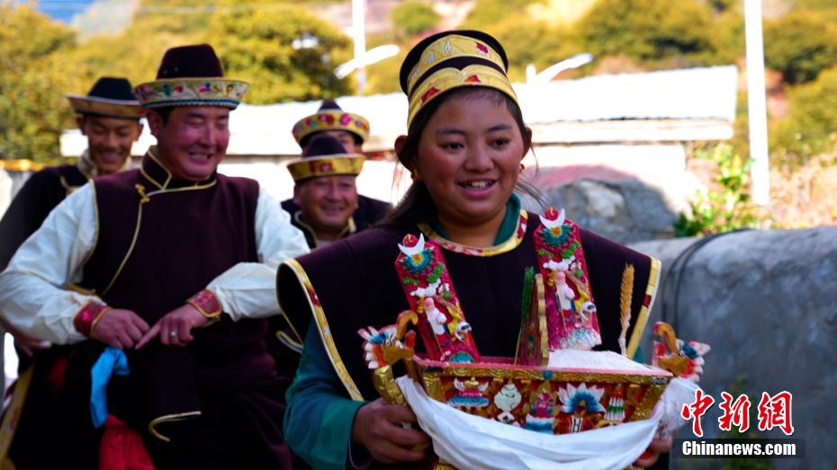 11月24日恰逢藏歷十月初一,西藏林芝迎來2023年工布新年,這是西藏最早的新年。工布新年以其悠久的歷史、鮮明的特色、豐富的內涵,于2006年被列入第一批西藏自治區非物質文化遺產保護名錄。圖為村民身著節日盛裝手捧“切瑪”拜年。 土旦曲扎 攝