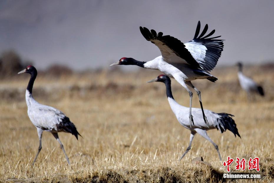 圖為11月21日,西藏日喀則市桑珠孜區(qū)邊雄鄉(xiāng),黑頸鶴在田間覓食、嬉戲。李林 攝