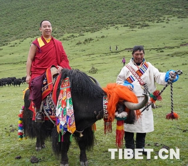 陽光雨露滋潤下,夏季的牧場上到處呈現出翠綠欲滴、生機勃勃的景致,鮮艷的野花與成群的牦牛更是給綠草如茵的牧場鑲嵌上靚麗的花邊。考察完雪林斯布牧場專業合作社后,十一世班禪一行來到放牧點,考察調研夏季牧場放牧點等情況。在這里,十一世班禪即興策馬徐行,展現出活力青春、風華正茂的一面。