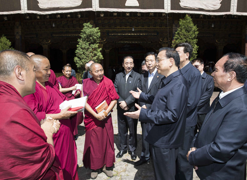 7月26日下午,李克強總理來到拉薩市大昭寺看望慰問西藏宗教界人士。始建于653年的大昭寺是西藏現存最輝煌的吐蕃時期寺廟建筑。李克強向西藏廣大宗教界人士致以誠摯的問候和衷心的祝福。他說,大昭寺是藏傳佛教的圣殿,同時見證了漢藏和親、民族團結的光輝歷史。希望西藏廣大宗教界愛國人士要以歷輩高僧大德為榜樣,為維護祖國統一、民族團結、社會和諧作出有益貢獻,促進宗教和睦、佛事和順、寺廟和諧。祝愿大家精修得道、身體健康、扎西德勒!