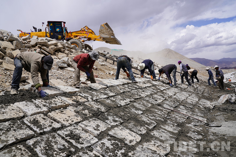 圖為農民工施工聯隊長洛桑白珍(左二)與農民工一起干活