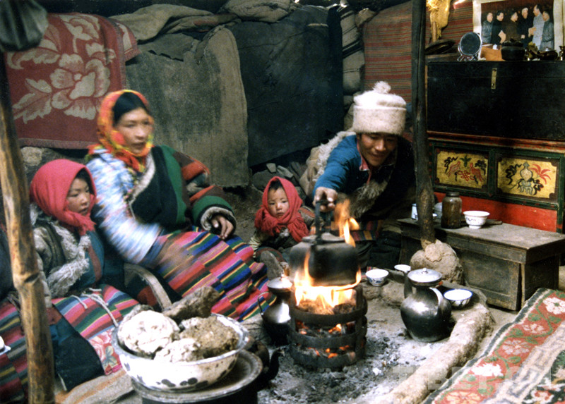 這是藏北尼瑪縣卓瓦鄉一戶牧民人家,在帳篷里圍著牛糞火爐燒茶取暖,其樂融融(唐召明1989年冬攝)