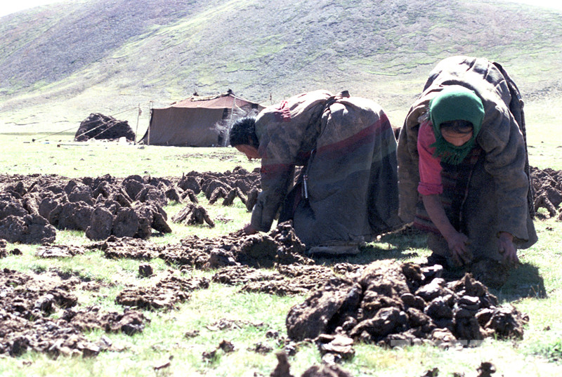 這是兩位藏北牧女正在草原上攤曬所撿拾的牛糞(唐召明1987年夏攝)