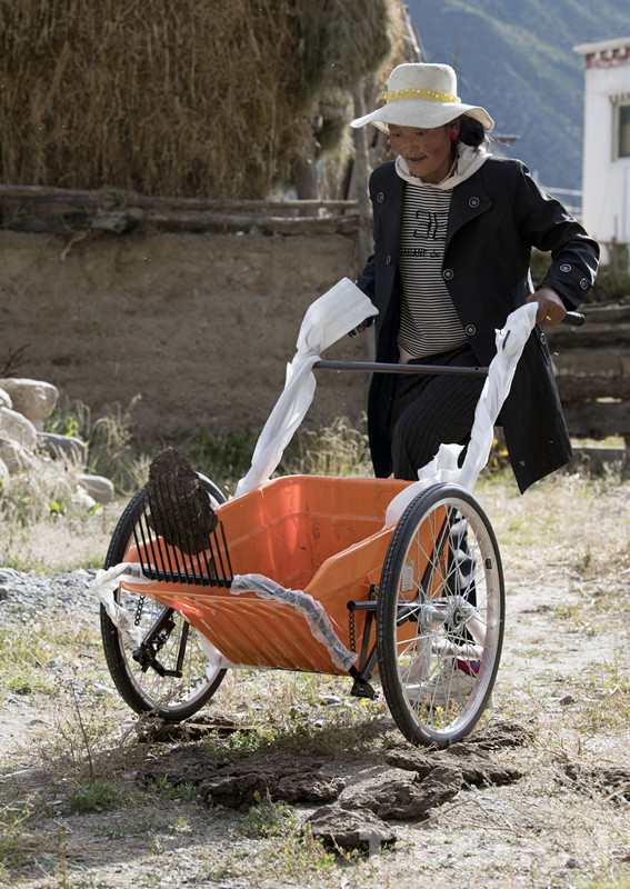 這是西藏昌都市邊壩縣邊壩鎮一位藏族婦女,正在使用北京建藏援藏工作者協會所捐贈的高原撿拾車撿拾牛糞(唐召明2020年8月19日攝)