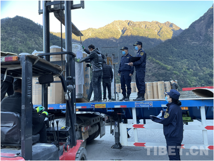 圖為聶拉木海關關員正在對援尼物資進行現場監管