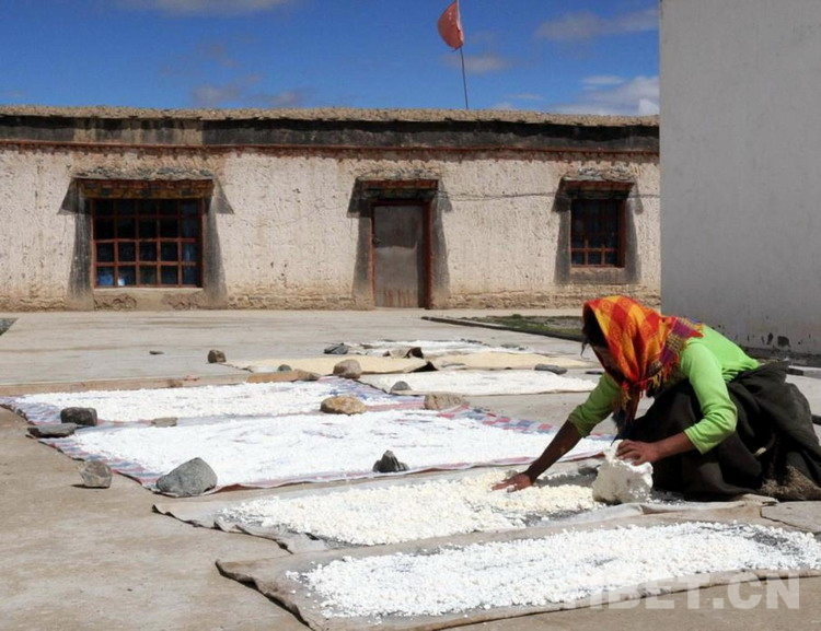 我發現,這里的專業合作經濟組織在遼闊的草原上發揮了很大作用。分離酥油生產間里,4位年輕的婦女在臉盆粗的牛奶木桶上,雙手握著木桿式活塞一上一下地打牛奶,分離酥油;一位年老的婦女在房前水泥空地上攤曬奶渣;4位牧民在村莊后為幾十頭牦牛挨個擠牛奶,還有幾位婦女手拎橡膠桶,在草地上撿拾濕漉漉的牛糞,然后倒在草地上,再用手攤成一個個牛糞餅曬干,最后摞成牛糞垛,作為冬季取暖的燃料……大家分工明確,各司其職。