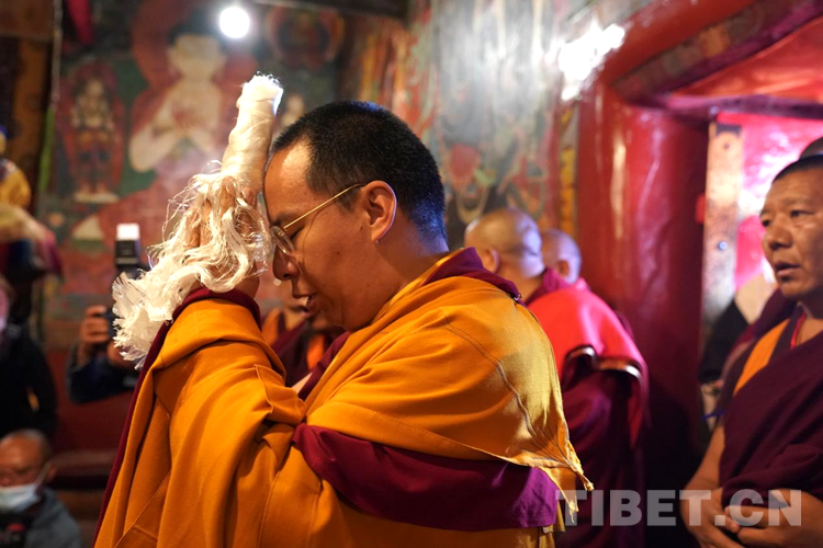 當日下午,班禪登上拉讓日光殿寶座,接受扎什倫布寺管委會僧人成員、高僧的朝拜,為他們摸頂賜福,并帶領高僧集體誦經祈禱。