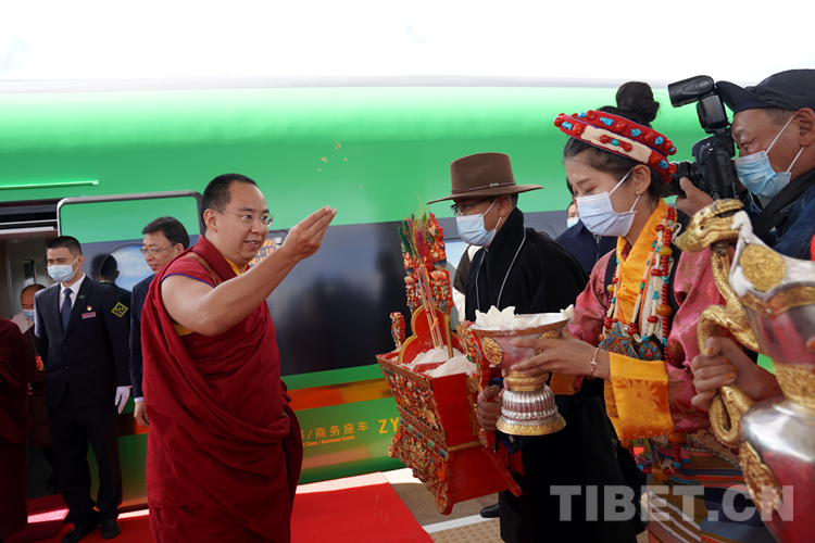 上午10點35分,班禪乘坐的復興號緩緩駛入日喀則火車站。西藏自治區人民政府副主席、黨組成員,日喀則市委書記張延清等市委相關領導在火車站迎接,與班禪互敬哈達、互致問候。