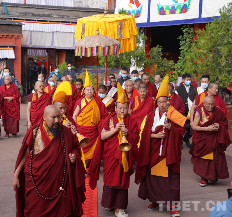 當日上午,扎什倫布寺前廣場上,信教群眾早早在此等候;通往扎什倫布寺的道路兩旁,手持法器的僧眾以藏傳佛教最高禮儀迎接班禪。