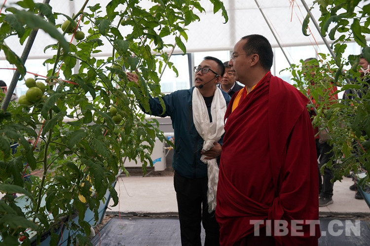 班禪走入蔬菜園、花卉園、熱帶植物園等溫室園區,不時俯身仔細查看農作物長勢。得知溫室內竟種有百香果,班禪高興地說道:“百香果可是熱帶植物,能在那曲海拔這么高的地方種出來,很不容易!”在蔬菜園,班禪打開種植擋板,聽取無土栽培種植技術介紹,詳細詢問營養液噴灑時間、頻率等情況,點頭表示肯定。
