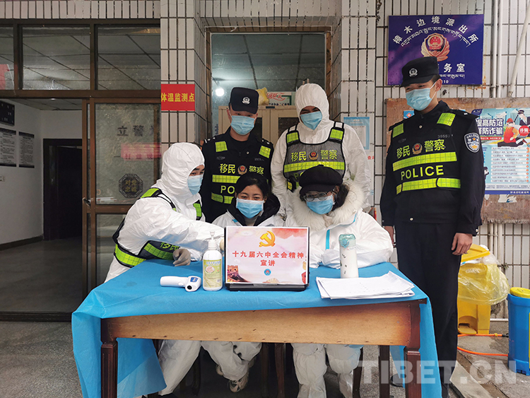 圖為樟木邊境派出所第三警務室執勤民警與口岸醫院醫護人員共同學習十九屆六中全會精神