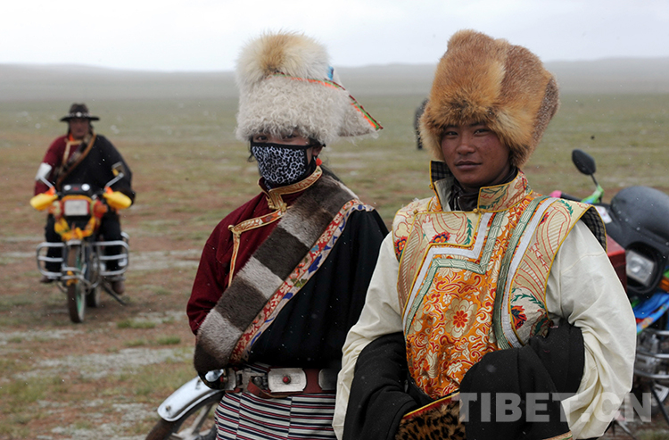 這是兩位青年牧民著盛裝參加雙湖縣的“撤區建縣”慶?;顒樱ㄌ普倜?013年7月26日攝)
