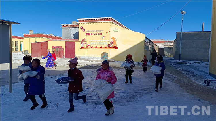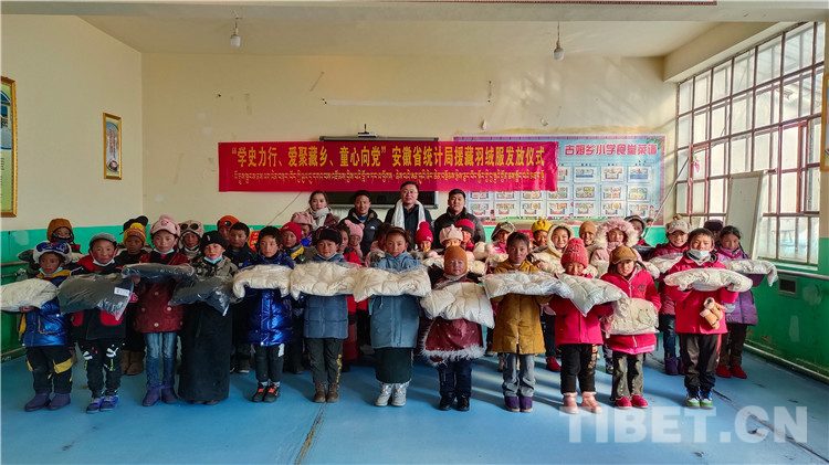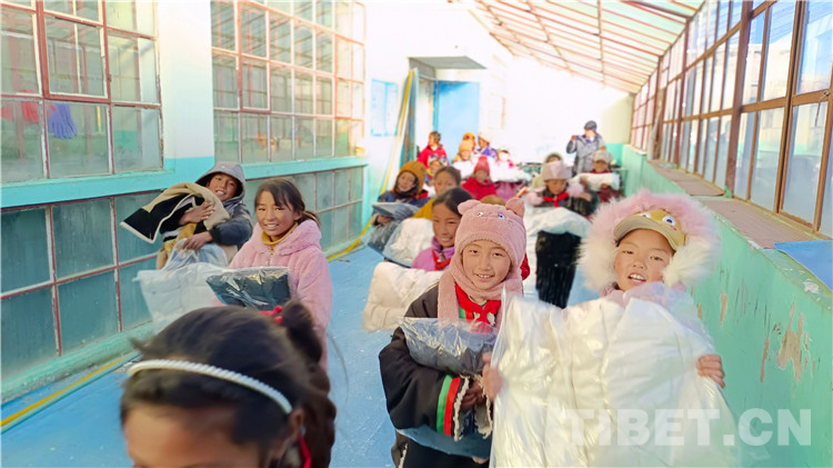 中國西藏網訊 “孩子們,排好隊,快到食堂去領羽絨服?!?央吉措姆老師高興地對一年級的學生說。待孩子們來到食堂,這里已是熱鬧一片,看到掛著“學史力行、愛聚藏鄉、童心向黨”愛心羽絨服發放儀式的橫幅,孩子們才恍然大悟,原來是援藏的叔叔給大家送新羽絨服來了。